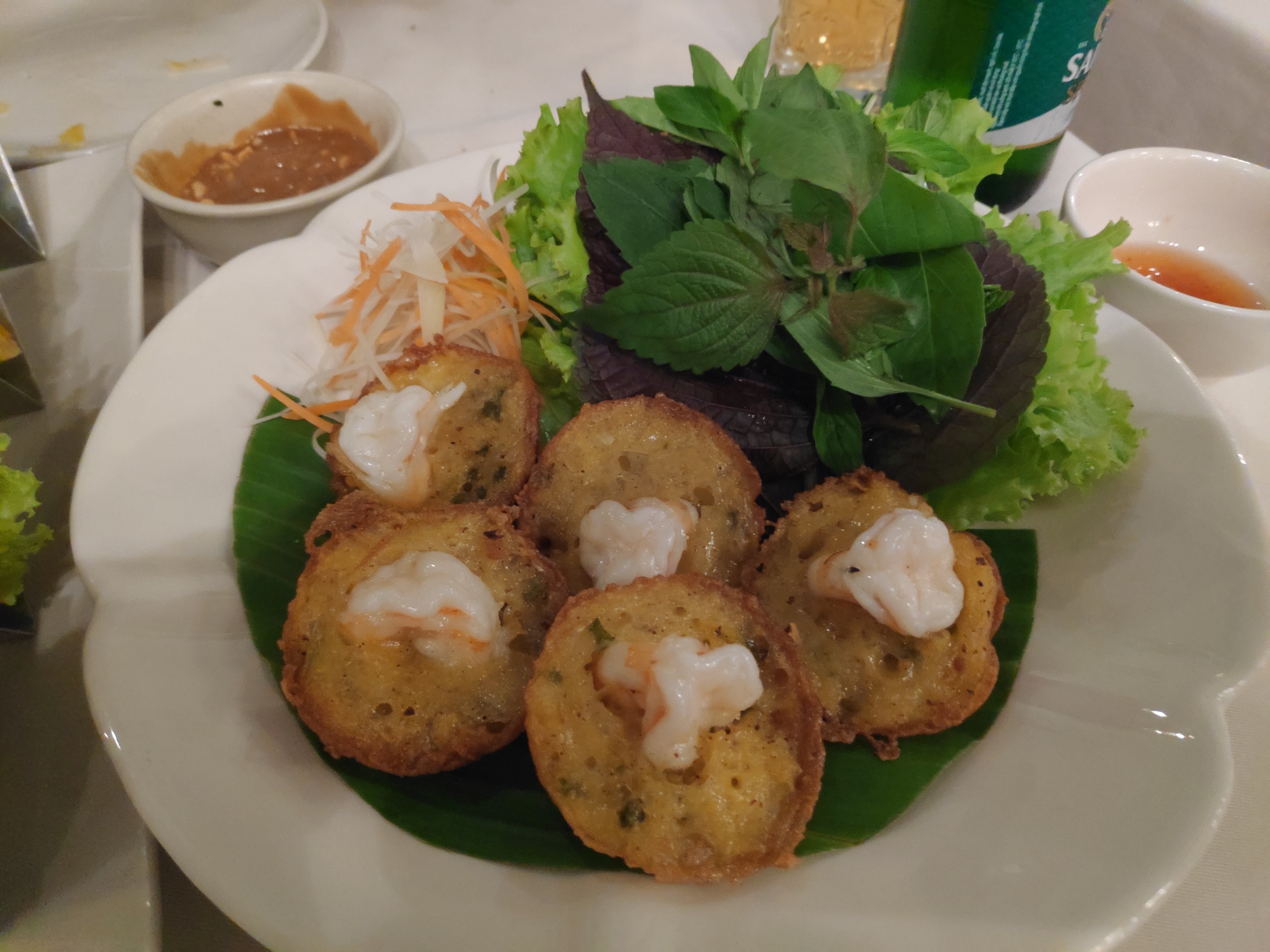 코코넛 반죽위에 새우를 얹었습니다. 반세오 먹을 때 먹는 음식이죠. 이름을 정확히는 모르겠는데 아무튼 새우가 있어서 맛있습니다. 근데 엄청 바삭할 것 같은데 코코넛이 약간에 푸석함이 있습니다. 그래도 맛있게 먹었습니다.