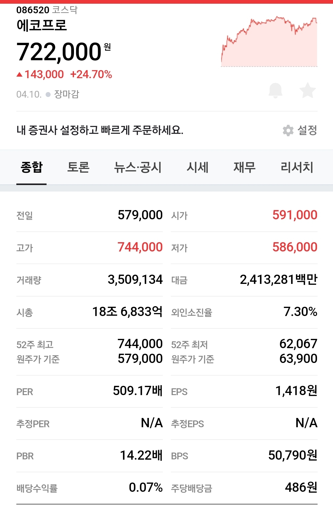 10일 에코프로는 전날보다 14만3000원(24.7%) 급등한 72만2000원에 거래를 마쳤습니다. 지난 5일 50만원대 주가에 진입한 뒤 불과 3거래일만에 70만원대 주가에 진입했습니다.